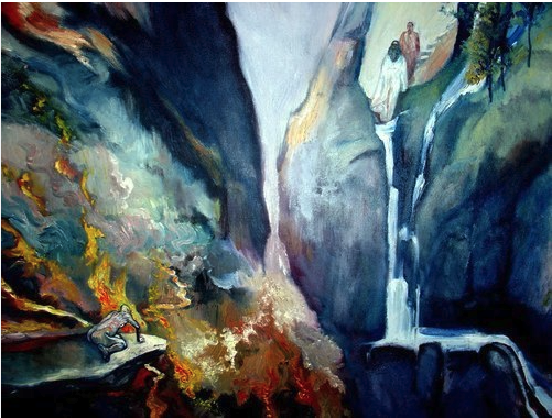 En la parábola, el mendigo Lázaro y el rico mueren: Lázaro es llevado al cielo mientras que el rico es condenado al infierno. El rico pide ayuda yo al menos que adviertan a su familia sobre su destino, pero Abraham le recuerda que existe un abismo infranqueable y que ya tienen a los profetas y a Moisés como advertencia.